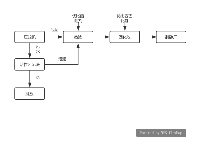 含水率75%原始底泥通过污泥泵传输到压滤机,压滤机压滤后的污水通过活性污泥法处理,处理后的水正常排放,处理后的泥与压滤机压滤后含水率为60%泥通过污泥泵传输到微波设备加热,加热至60℃时添加优比西药剂,后加热至90℃(污泥在微波设备中停留五分钟)后通过泵传输至固化池,在固化池内添加优比西固化剂固化污泥后运至烧砖厂。